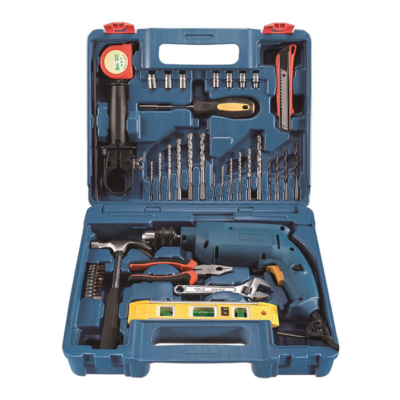 accessories & package: hammer drill bit set, twist drill bit set, woodworking drill set, level ruler, screwdriver bit set, vice, adjustable wrench, claw hammer, screwdriver, screw socket set, utility knife, tape measure 3m,auxiliary handle, depth gauge, chuck wrench, carbon brush, plastic case packing